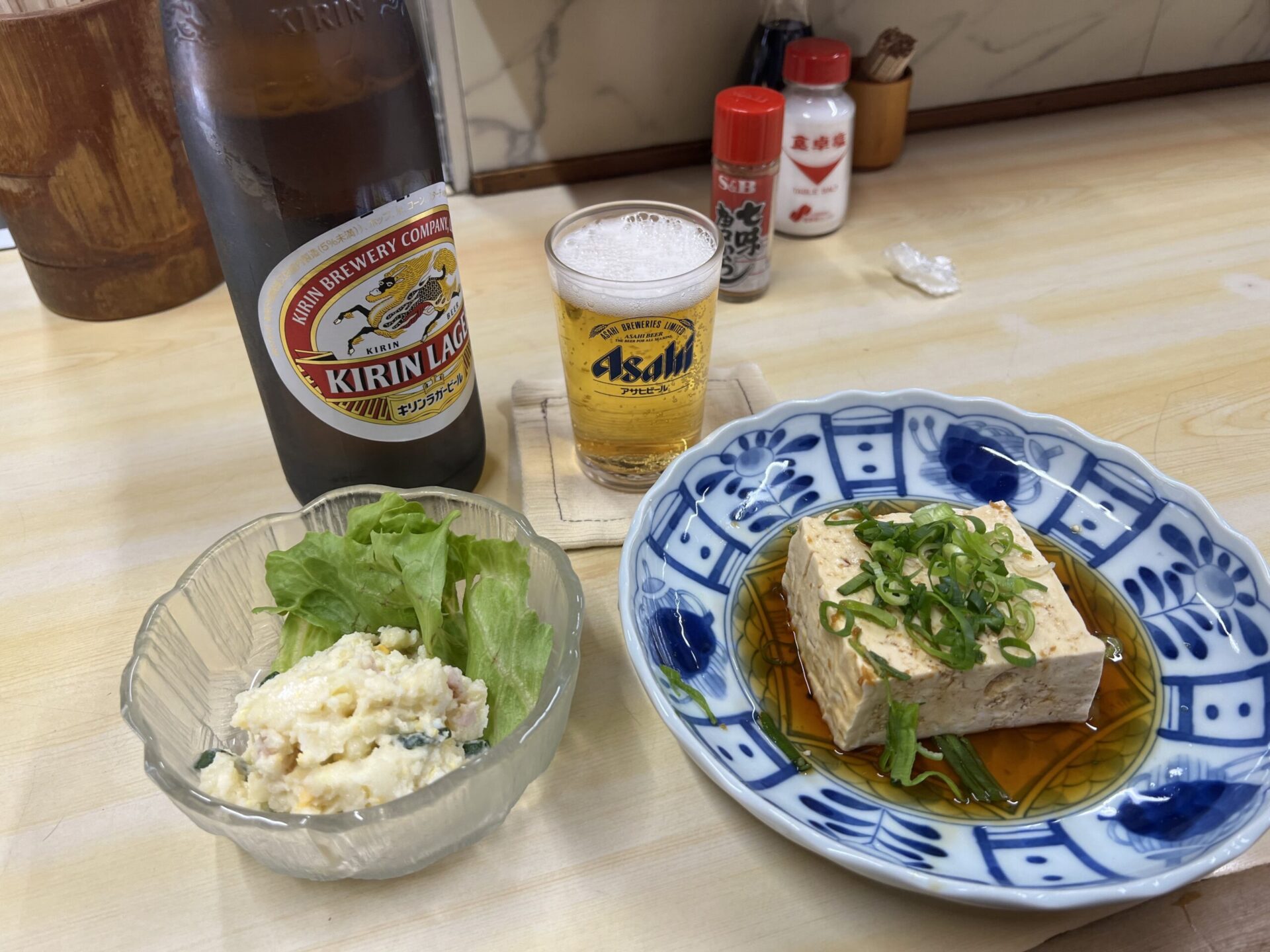 あてはおでんの豆腐を生姜醤油で(ちなみに味噌だれもあります)、あとはポテサラを注文