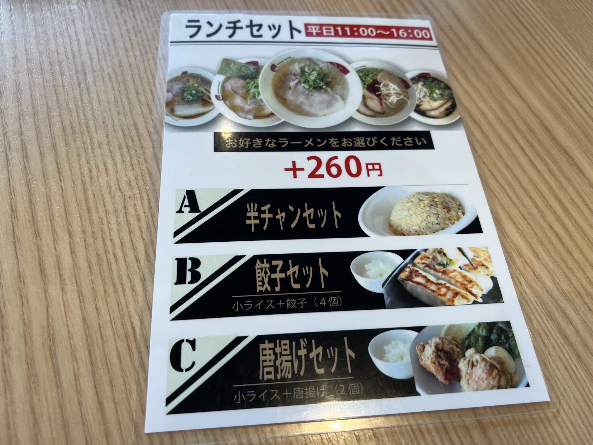 今回は豚骨ラーメンでランチセットのA、半ちゃんセットで注文しました
