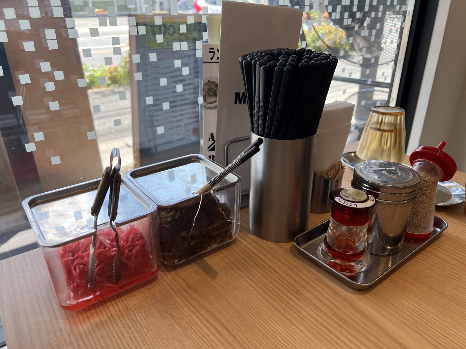辛子高菜、紅生姜、すりごまとラーメンをカスタマイズする脇役たちが勢揃いです
