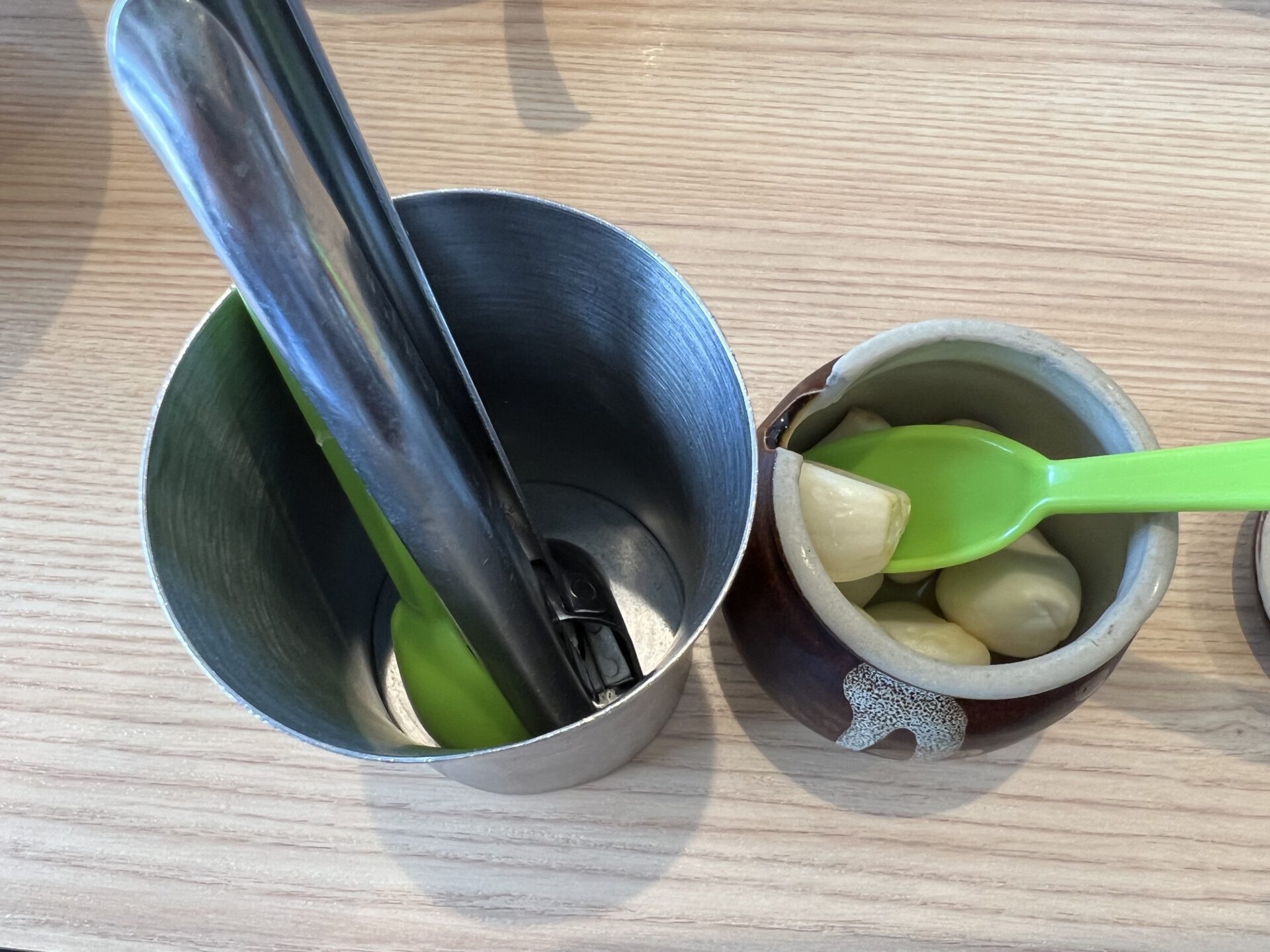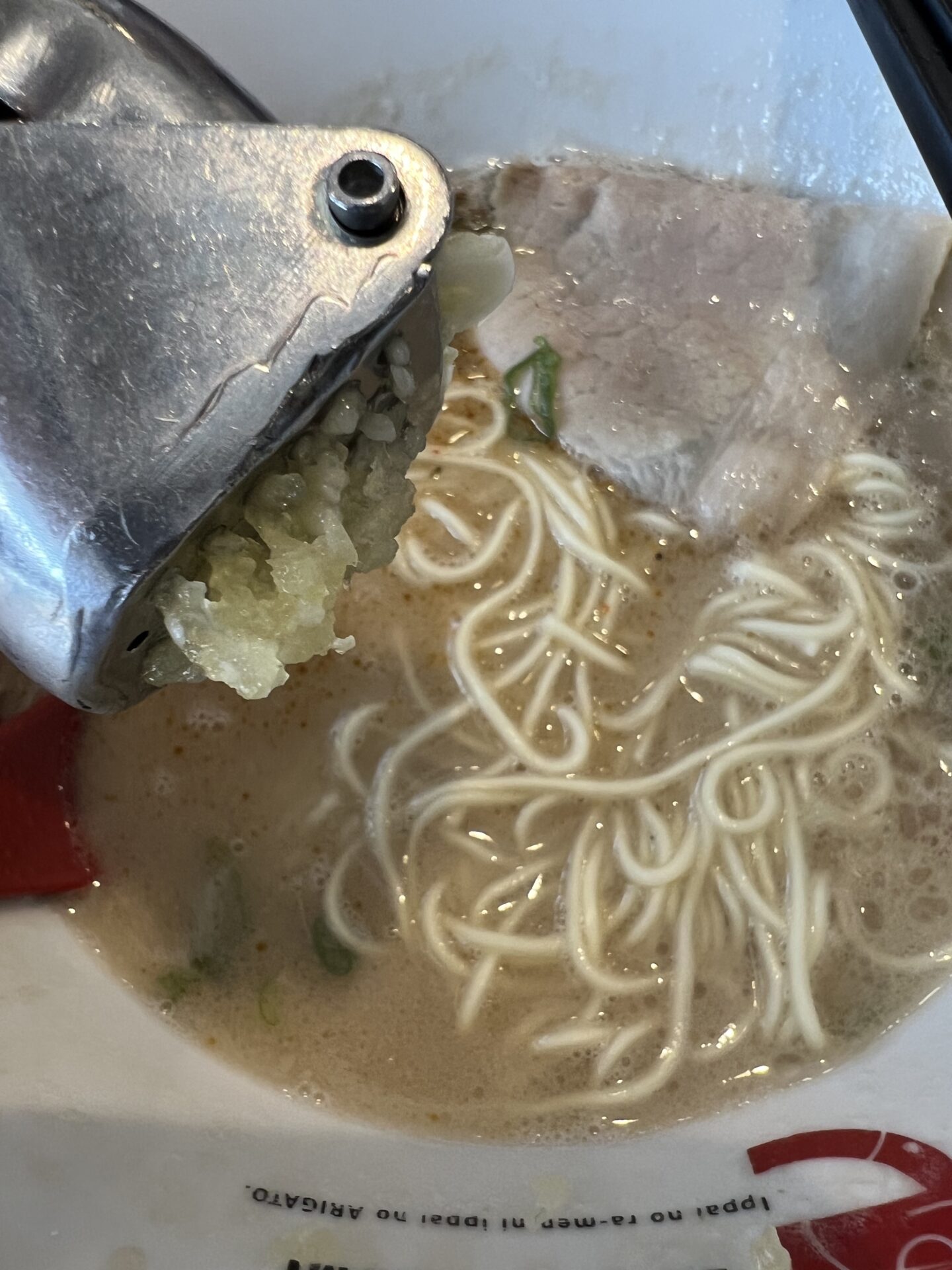 おろしニンニクと思いきや丸々のニンニクとクラッシャーがお出迎え