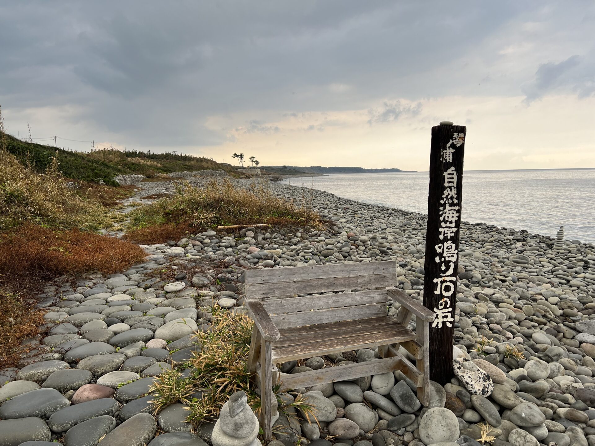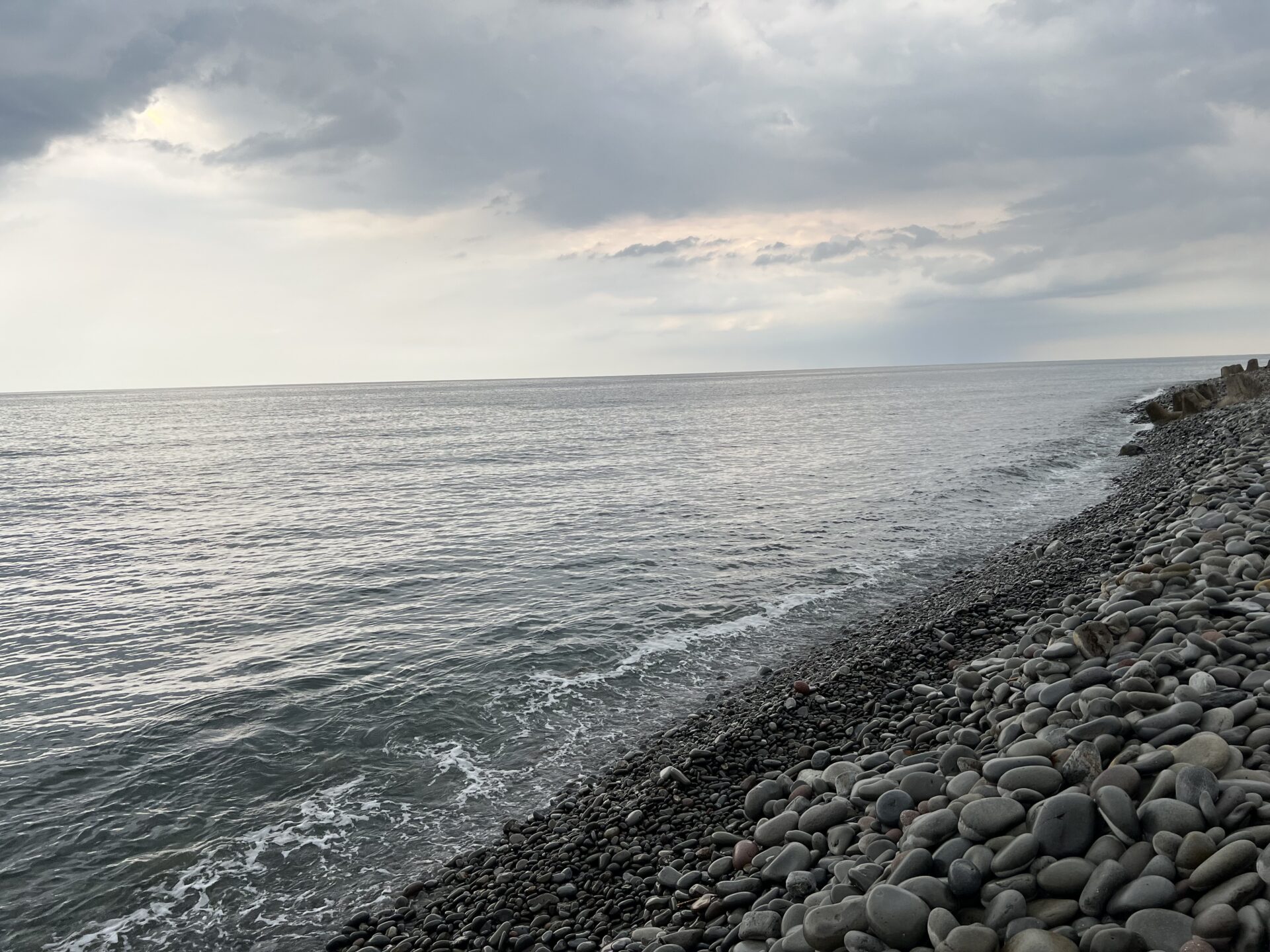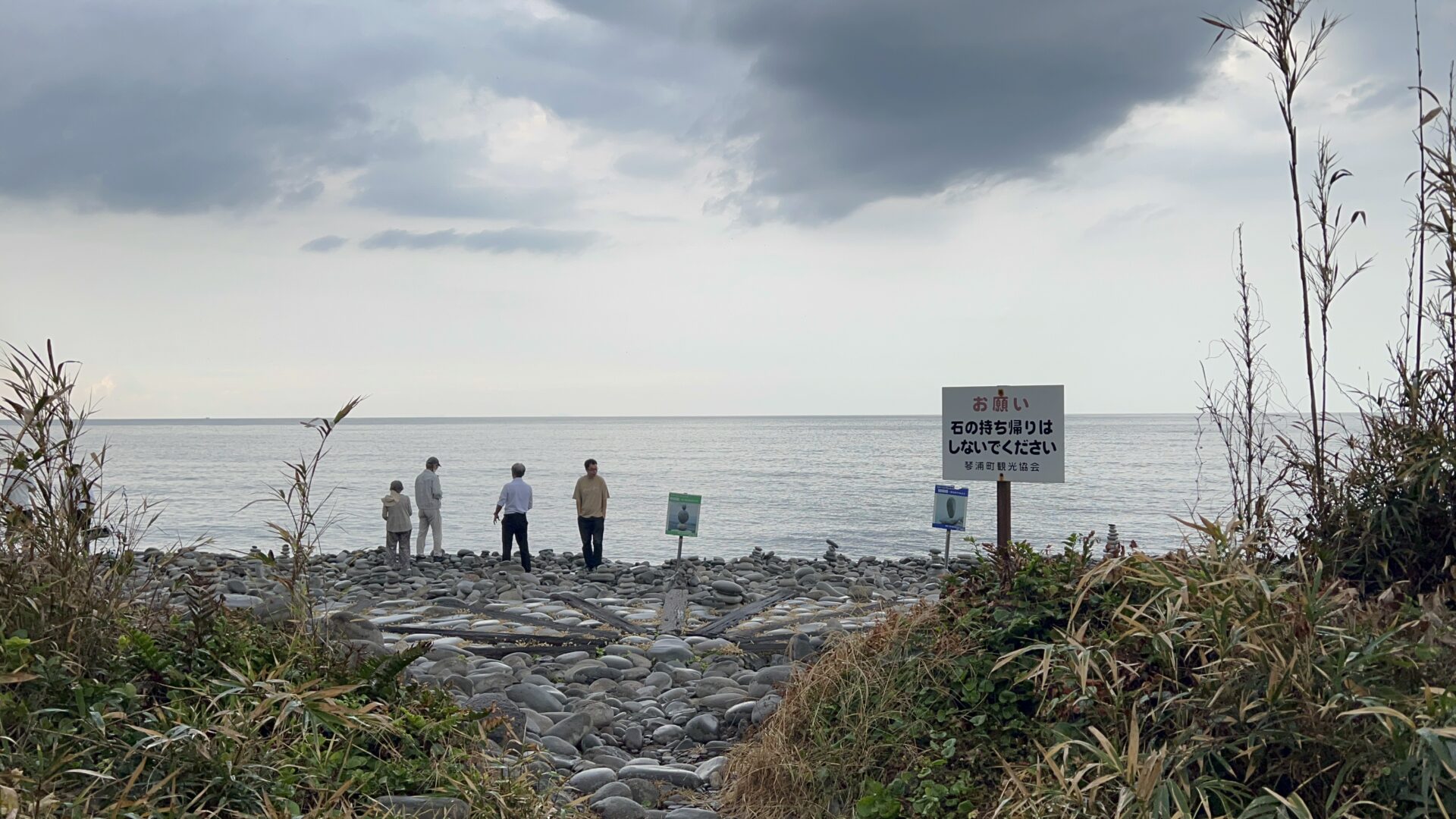 この砂浜ならぬ、石浜が見えるとこまでやってくると、、、